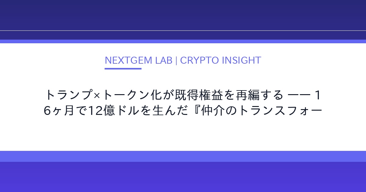 ドナルド・トランプ氏の仮想通貨プロジェクトが叩き出した12億ドルという数字。その本質は「中抜きの消滅」ではなく、既存の金融からデジタルトークンの新勢力へと『仲介の主権』が移ったことにありました。