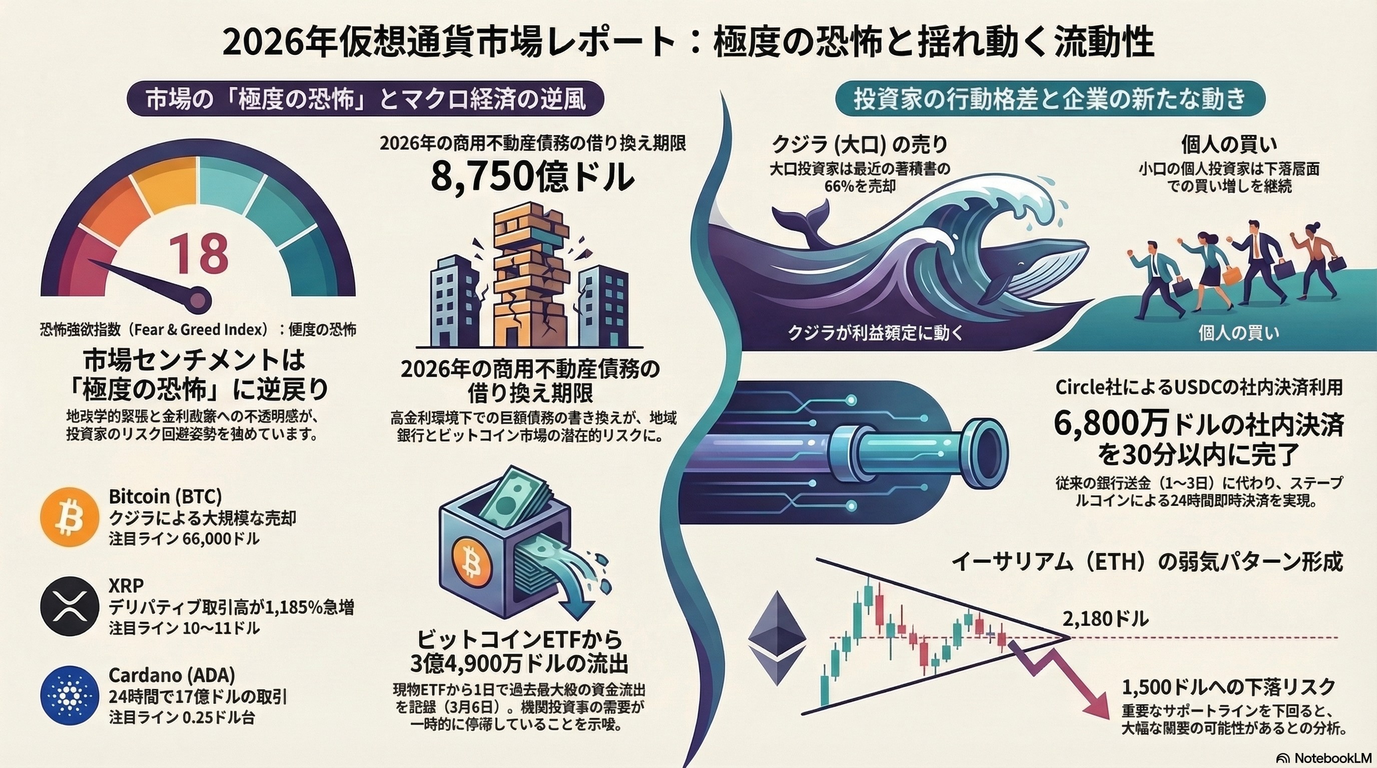 2026年3月最新!地政学リスクで揺れるビットコイン市場。原油高騰、商業不動産ローンの満期、そして7,000万ドル規模のロング清算リスクについて、天才科学者リサ所長が冷徹にデータ分析します。